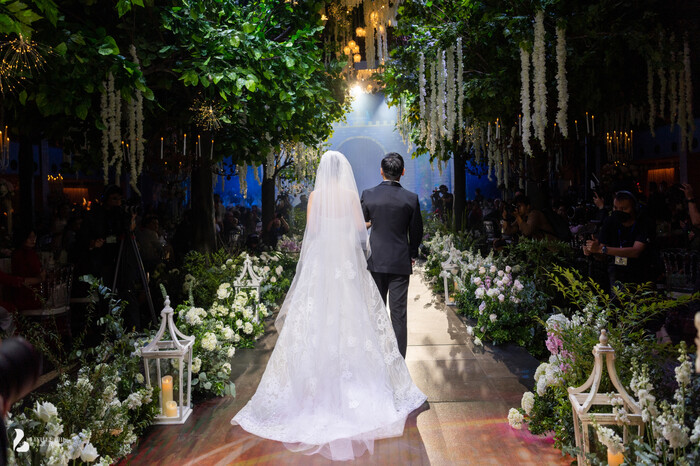 | Cô dâu - chú rể sánh vai bước vào lễ đường trong sự chúc phúc của mọi người. |