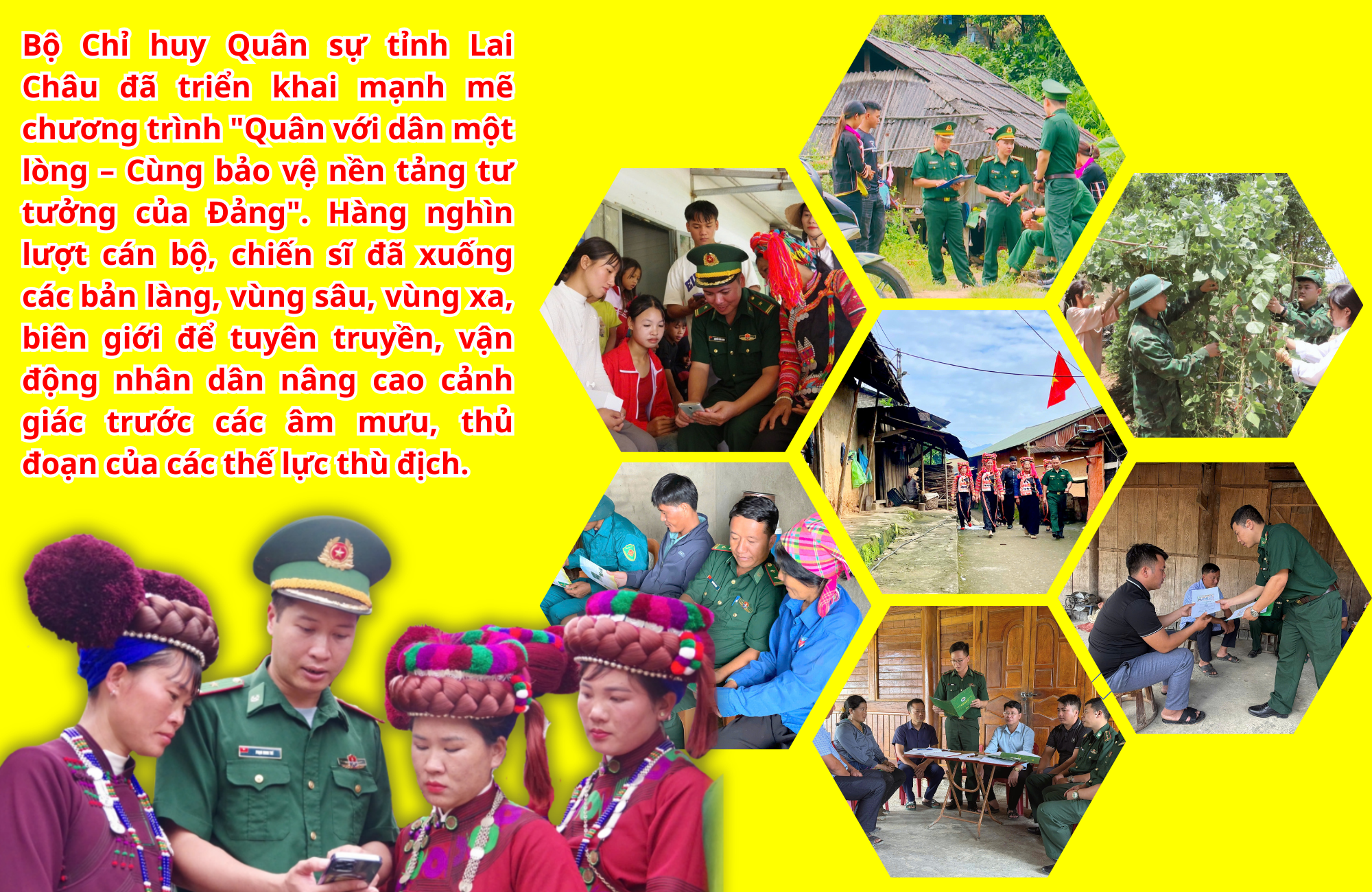 Công tác bảo vệ nền tảng tư tưởng của Đảng không thể chỉ dừng lại trong doanh trại. Hiểu rõ điều này, Bộ Chỉ huy Quân sự tỉnh Lai Châu đã triển khai mạnh mẽ chương trình "Quân với dân một lòng – Cùng bảo vệ nền tảng tư tưởng của Đảng". Hàng nghìn lượt cán bộ, chiến sĩ đã xuống các bản làng, vùng sâu, vùng xa, biên giới để tuyên truyền, vận động nhân dân nâng cao cảnh giác trước các âm mưu, thủ đoạn của các thế lực thù địch.