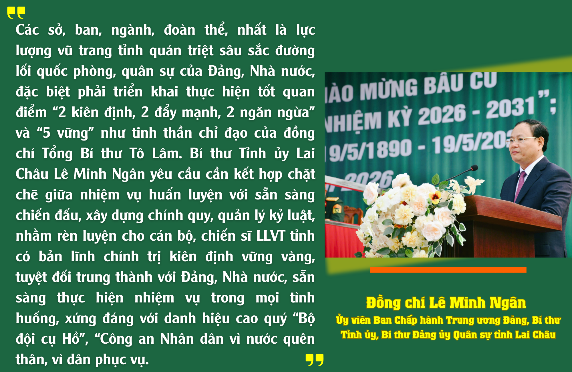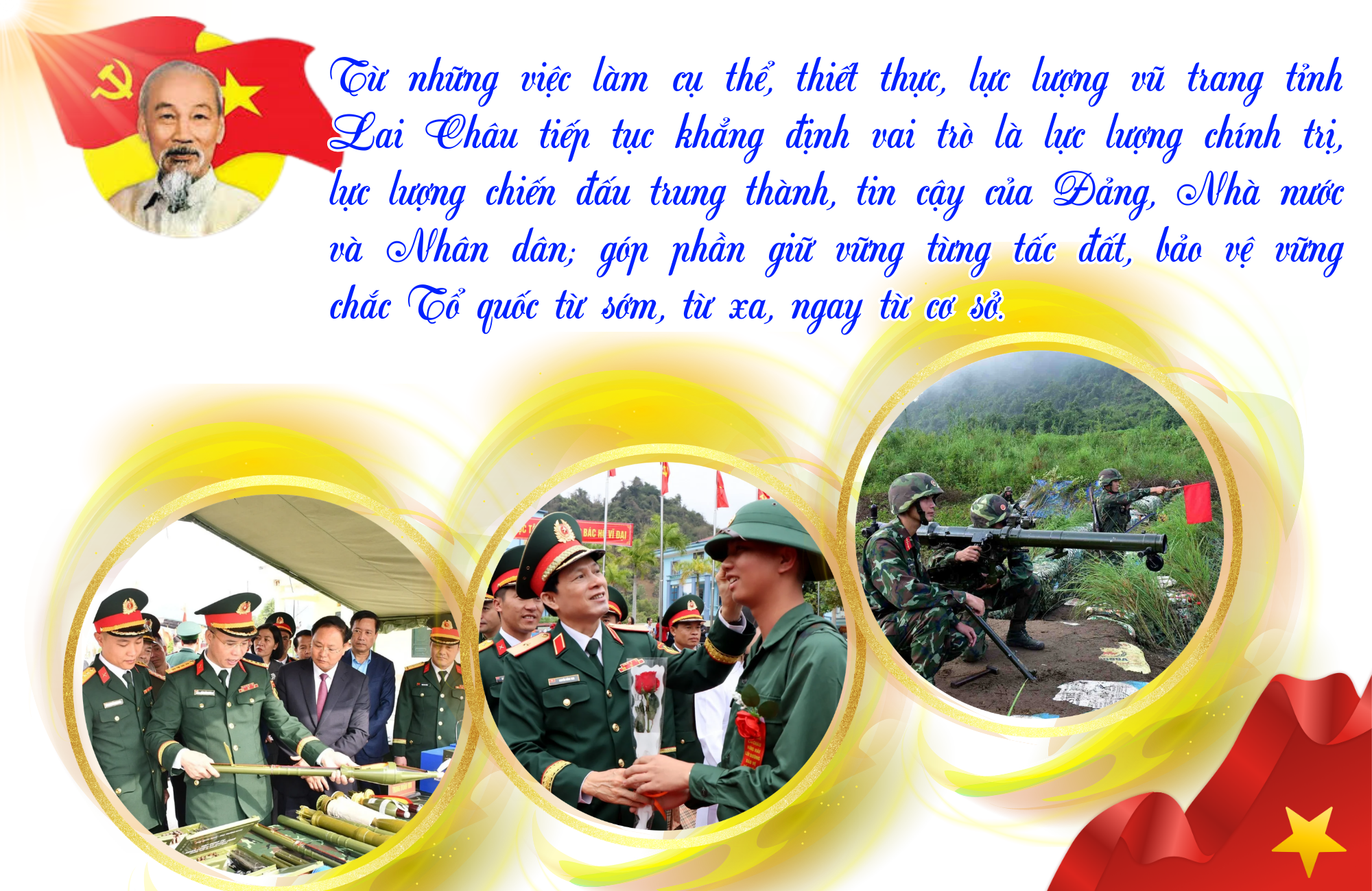 Từ những việc làm cụ thể, thiết thực, lực lượng vũ trang tỉnh Lai Châu tiếp tục khẳng định vai trò là lực lượng chính trị, lực lượng chiến đấu trung thành, tin cậy của Đảng, Nhà nước và Nhân dân; góp phần giữ vững từng tấc đất, bảo vệ vững chắc Tổ quốc từ sớm, từ xa, ngay từ cơ sở. Nơi vùng biên cương Lai Châu, bảo vệ nền tảng tư tưởng của Đảng trong quân đội không chỉ là nhiệm vụ chính trị mà còn là yếu tố quyết định sự ổn định và phát triển bền vững của địa phương.
