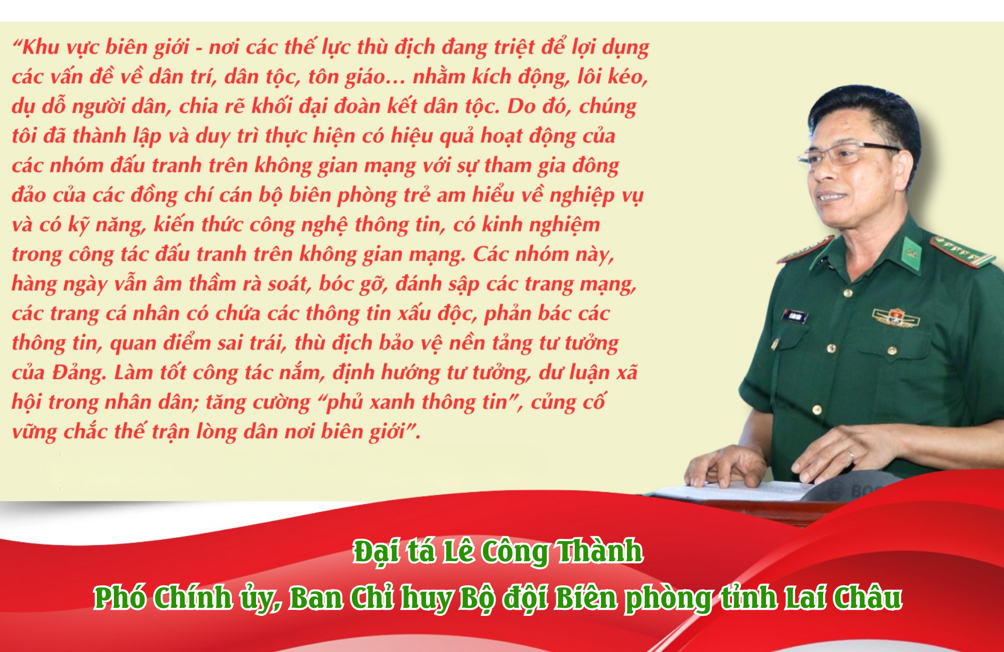 Một trong những điểm nhấn trong công tác bảo vệ nền tảng tư tưởng của Đảng ở Lai Châu là việc thành lập 47 tổ phản ứng nhanh trên không gian mạng. Các tổ này gồm những cán bộ, chiến sĩ có trình độ công nghệ thông tin, am hiểu mạng xã hội và có khả năng viết bài tuyên truyền. Nhiệm vụ của các tổ là kịp thời phát hiện, xử lý và đấu tranh phản bác thông tin sai trái, đồng thời lan tỏa các nội dung tích cực về đường lối của Đảng, hình ảnh Bộ đội Cụ Hồ và thành tựu phát triển của địa phương. Bộ Chỉ huy Quân sự tỉnh còn triển khai mô hình “Kết nghĩa tư tưởng” giữa các đơn vị quân đội với các chi bộ, bản làng vùng sâu, vùng xa. Qua mô hình này, cán bộ, chiến sĩ thường xuyên xuống cơ sở sinh hoạt, trao đổi, tuyên truyền chủ trương, chính sách của Đảng và Nhà nước.