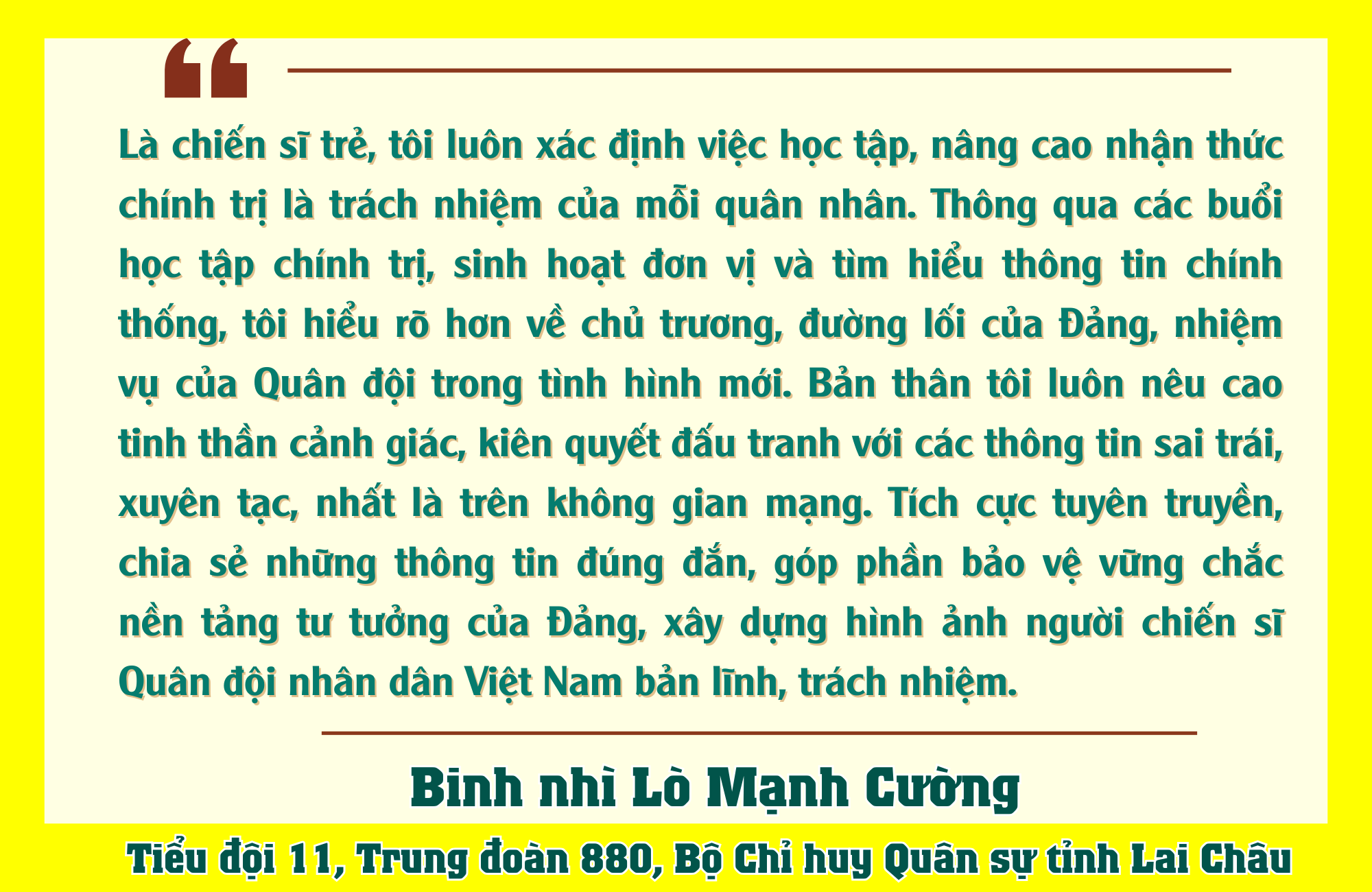 Đại tá Triệu Kim Thắng – Chính ủy, Bộ Chỉ huy Quân sự tỉnh Lai Châu cho biết: “Bảo vệ nền tảng tư tưởng của Đảng là nhiệm vụ vừa cấp bách, vừa lâu dài, có ý nghĩa đặc biệt quan trọng trong sự nghiệp xây dựng và bảo vệ Tổ quốc. Đối với lực lượng vũ trang tỉnh Lai Châu, chúng tôi xác định đây không chỉ là nhiệm vụ của cấp ủy, chỉ huy các cấp mà còn là trách nhiệm của mỗi cán bộ, chiến sĩ. Vì vậy, Bộ Chỉ huy Quân sự luôn chú trọng đẩy mạnh công tác giáo dục chính trị, tư tưởng, nâng cao nhận thức, bản lĩnh chính trị, ý thức trách nhiệm và tinh thần cảnh giác cách mạng cho bộ đội. Đồng thời, chủ động tham gia đấu tranh, phản bác kịp thời các quan điểm sai trái, thù địch; không để bị động, bất ngờ trong mọi tình huống. Qua đó góp phần giữ vững trận địa tư tưởng của Đảng trong Quân đội, xây dựng lực lượng vũ trang tỉnh Lai Châu vững mạnh về chính trị, tư tưởng và tổ chức, hoàn thành tốt mọi nhiệm vụ được giao, bảo vệ vững chắc chủ quyền, an ninh nơi biên cương của Tổ quốc”.
