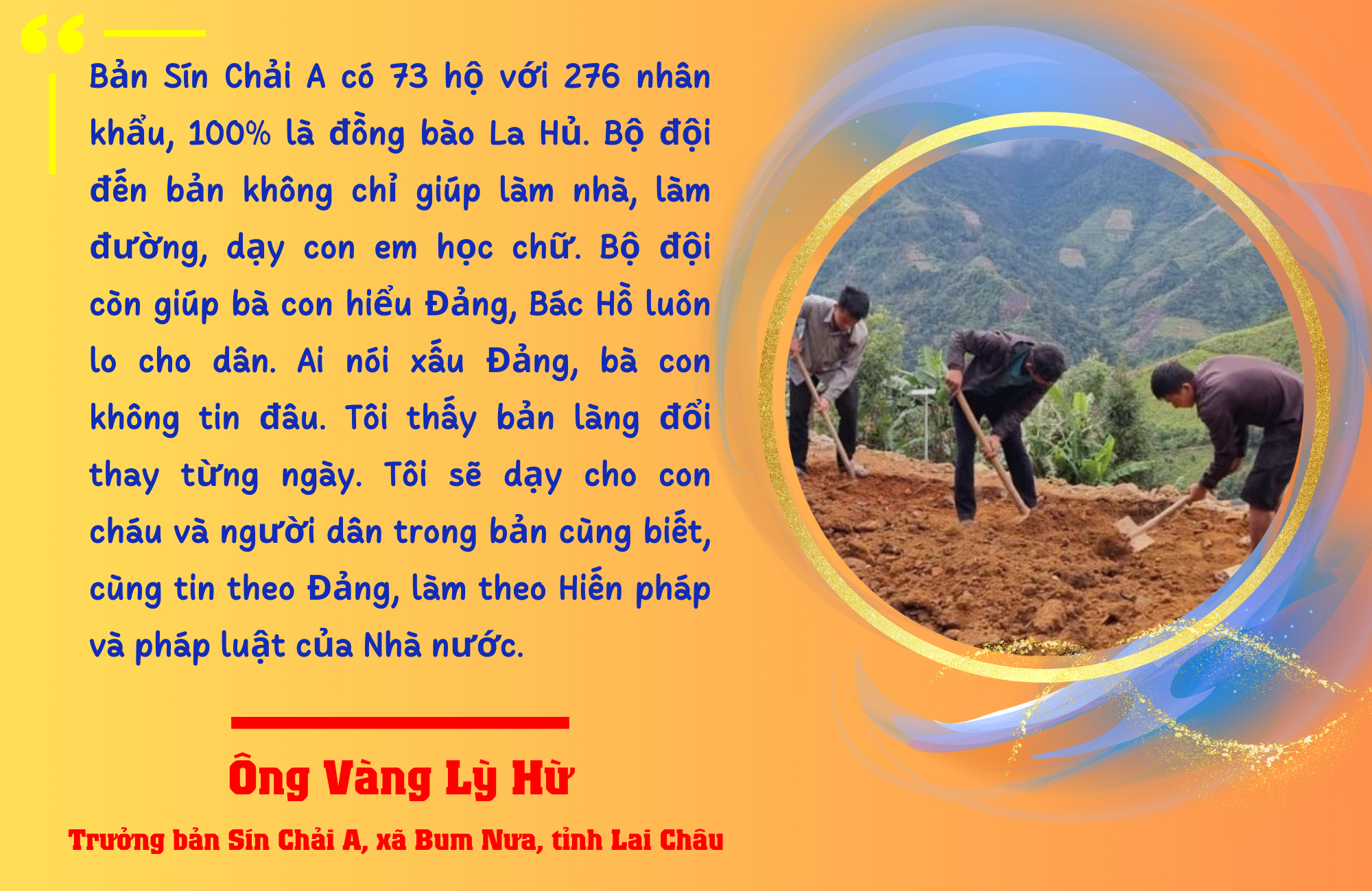 Ông Vàng Lỳ Hừ, Trưởng bản Sín Chải A, xã Bum Nưa, tỉnh Lai Châu – người có uy tín lớn trong cộng đồng người La Hủ – không giấu được sự xúc động khi nói về mối quan hệ giữa đồng bào và các chiến sĩ Bộ đội Cụ Hồ: