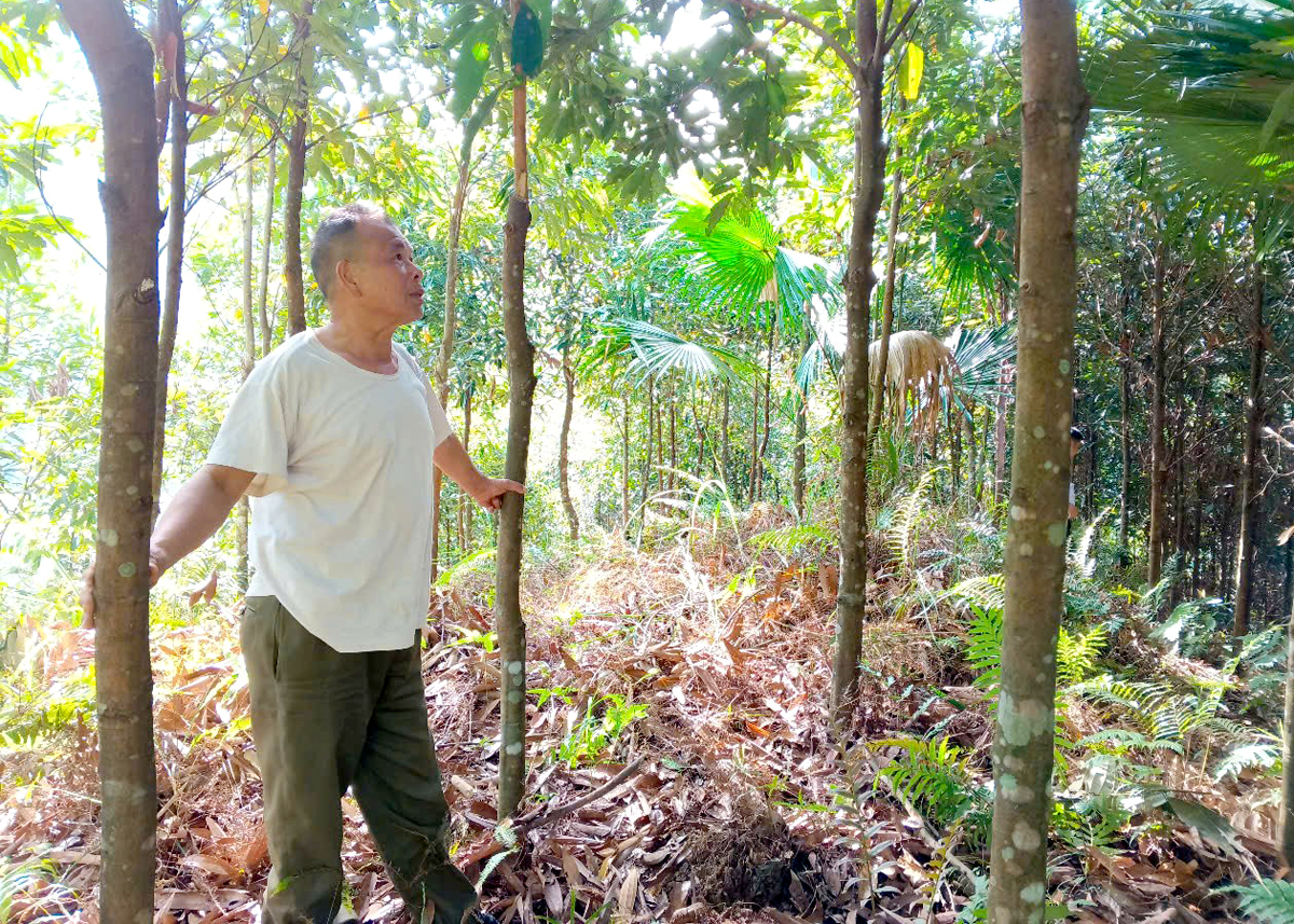 | Ông Lục Hải Đường, thôn Tân Sơn giới thiệu về đồi quế của gia đình đã đủ tuổi khai thác. |