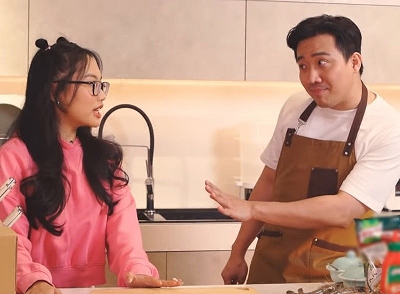 | Phương Mỹ Chi gọi Trấn Thành là chú, xưng con. Phía nam MC hết lời khen ngợi nữ ca sĩ. Ảnh: Gia Đình Việt Nam. |